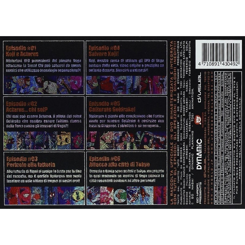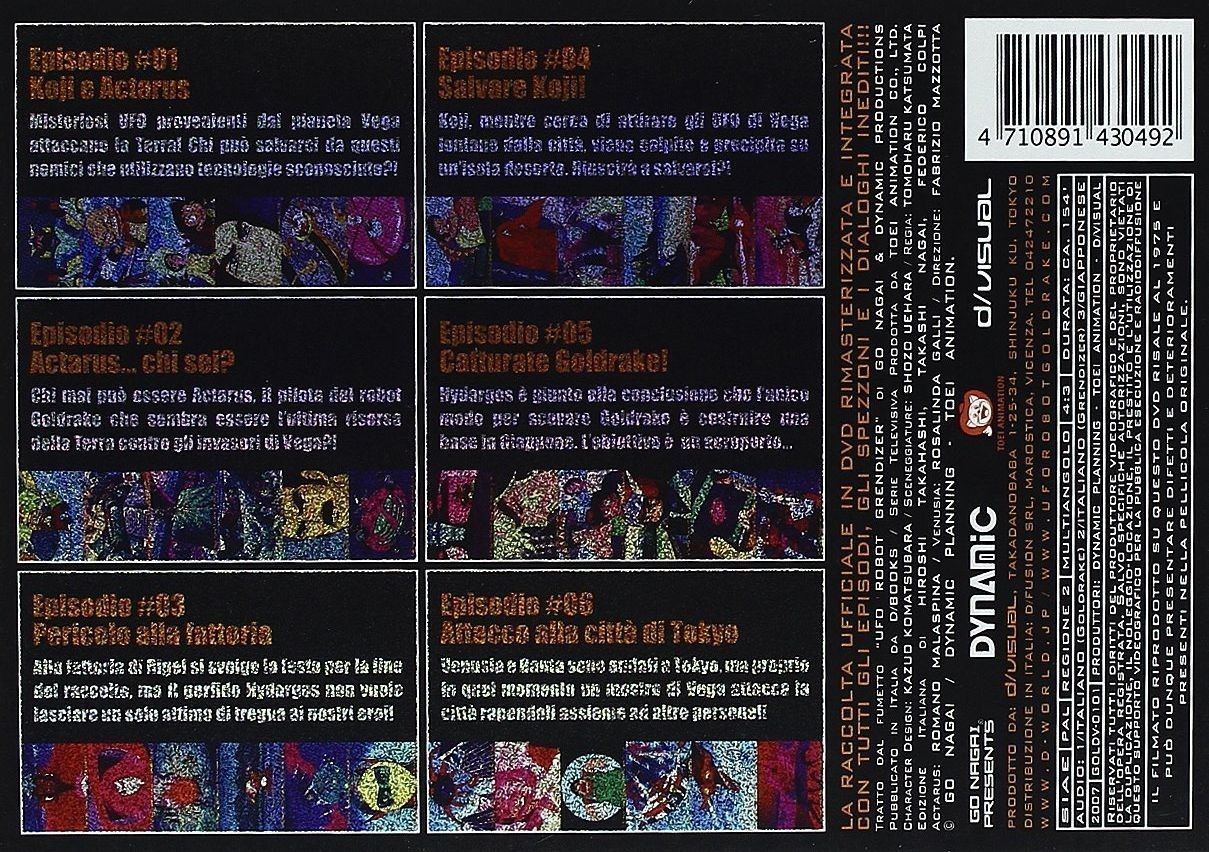 E le sorprese non finiscono qui, perche' i DVD presentano una funzione multiangolo in corrispondenza delle sigle di inizio, di quelle di coda e delle anticipazioni (presentate per LA PRIMA VOLTA in Italia!), attraverso la quale e' possibile vedere sia l'edizione con i titoli italiani che quella con i titoli giapponesi! A corredare il tutto vengono le bellissime e indimenticate voci dei doppiatori originali dell'epoca, da Romano Malaspina - Actarus a Rosalinda Galli - Venusia, e le mitiche sigle "Ufo Robot" (Si trasforma in un razzo missile...) e "Shooting Star" nell'edizione originale degli Actarus! E contemporaneamente parte anche il ricchissimo sito www.uforobotgoldrake.com dedicato solo ed esclusivamente al nostro eroe! Cosa volere di piu'?!